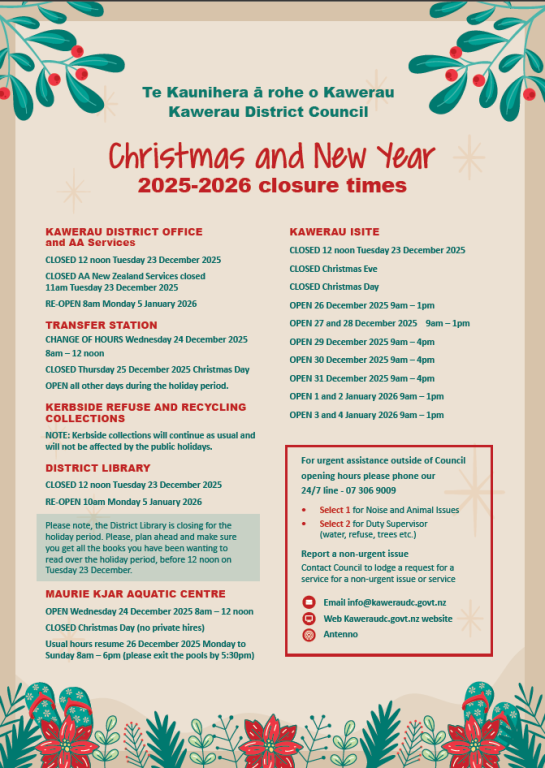 Permits are available from the Kawerau isite from 12noon 19 December to 5 January (except Christmas Day, the forest is closed, and permits will not be issued) during usual operations hours 9am to 4pm weekdays and 9am to 1pm on public holidays and weekends.